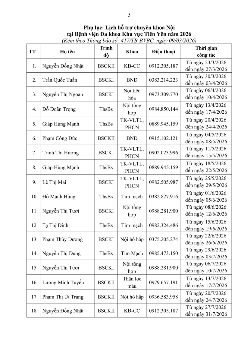 Bệnh viện bãi cháy cử bác sĩ chuyên ngành nội khoa hỗ trợ chuyên môn tại bệnh viện đa khoa khu vực tiên yên năm 2026