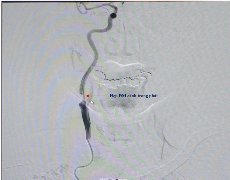 Để đánh giá chính xác tổn thương, bệnh nhân được chỉ định chụp mạch máu não bằng phương pháp chụp mạch số hóa xóa nền (DSA). Kết quả cho thấy gốc động mạch cảnh trong bên phải bị hẹp rất nặng, khoảng 90%. Đây là một trong số nguyên nhân chính gây giảm tưới máu bán cầu não phải, dẫn đến tình trạng yếu liệt nửa người trái của bệnh nhân.