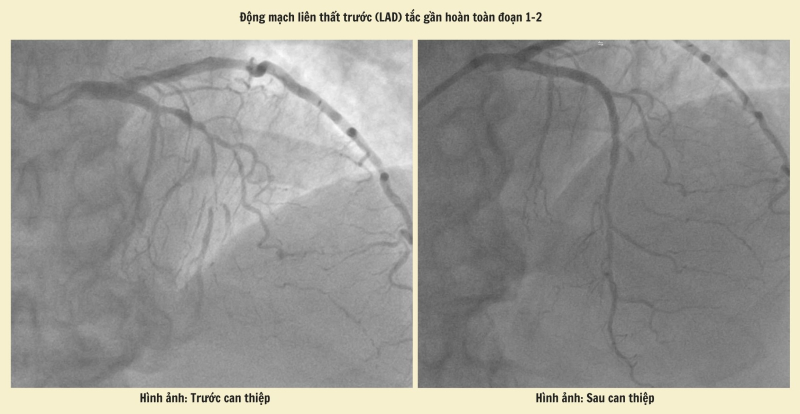 vành phải hẹp 95%; Động mạch liên thất trước tắc gần hoàn toàn đoạn 1–2.