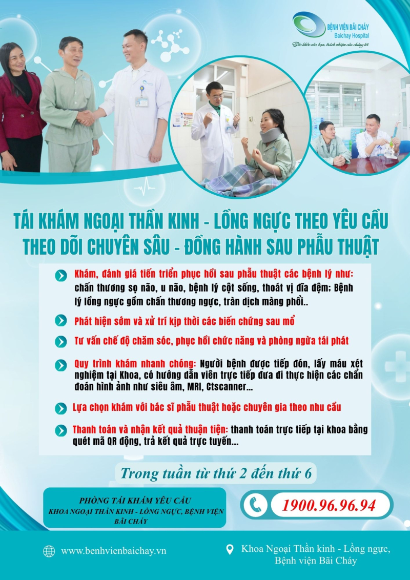 Sau phẫu thuật và điều trị các bệnh lý ngoại khoa, đặc biệt trong lĩnh vực Ngoại Thần kinh và Ngoại Lồng ngực, việc tái khám định kỳ đóng vai trò vô cùng quan trọng nhằm đánh giá kết quả điều trị, phát hiện sớm biến chứng và điều chỉnh phác đồ kịp thời. Tại Bệnh viện Bãi Cháy, Phòng tái khám chuyên khoa Ngoại Thần kinh – Lồng ngực được thành lập là cầu nối chăm sóc liên tục cho người bệnh sau phẫu thuật.