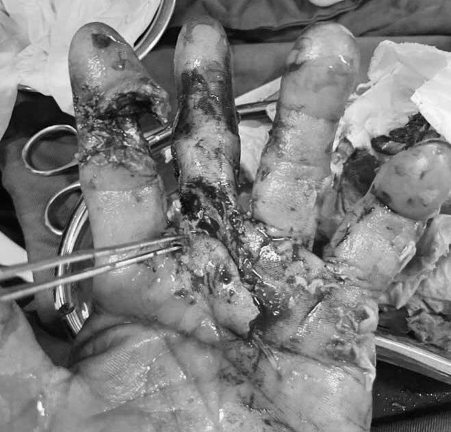 Bệnh nhân V.V.C (68 tuổi, ở phường Tuần Châu, tỉnh Quảng Ninh) bị chấn thương dập nát phức tạp ngón II, III của bàn tay trái, trong đó đốt 2 ngón tay trỏ đứt gần rời do tai nạn lao động (TNLĐ). Các bác sĩ Bệnh viện Bãi Cháy đã thăm khám đánh giá sơ bộ tổn thương phức tạp ngón II, III, ngón III đứt hoàn toàn hệ thống gân gấp nông – sâu, ngón II đứt gần rời vị trí ngang đốt 2 của ngón, chỉ còn dính lại 1 cầu da mỏng mặt mu ngón tay, mất hoàn toàn mạch máu, thần kinh nuôi đầu xa của ngón.