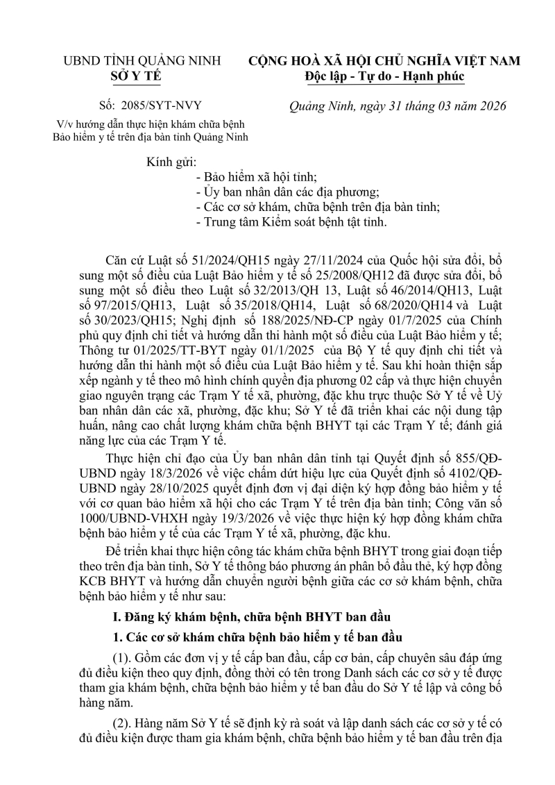 Nhằm đảm bảo quyền lợi Bảo hiểm y tế, nâng cao hiệu quả phân tuyến và chất lượng điều trị, tạo điều kiện thuận lợi nhất cho người dân trong việc tiếp cận các dịch vụ y tế chất lượng cao, Sở Y tế tỉnh Quảng Ninh đã ban hành công văn 2085/SYT-NVY ngày 31/03/2026 hướng dẫn thực hiện khám chữa bệnh Bảo hiểm y tế trên địa bàn tỉnh Quảng Ninh với những điều chỉnh phù hợp với năng lực hệ thống y tế và đảm bảo quyền lợi tối đa cho người dân.
