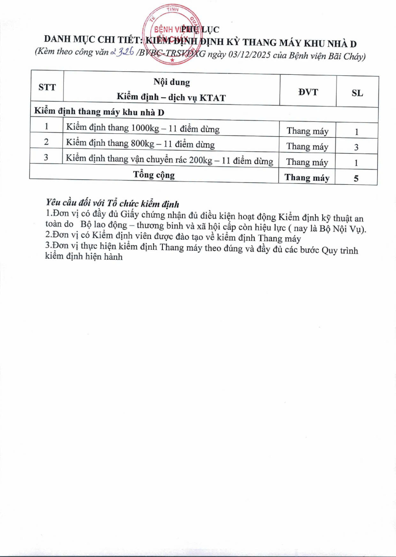 Thông báo 2326 nhu cầu kiểm định định kỳ thang máy khu nhà D