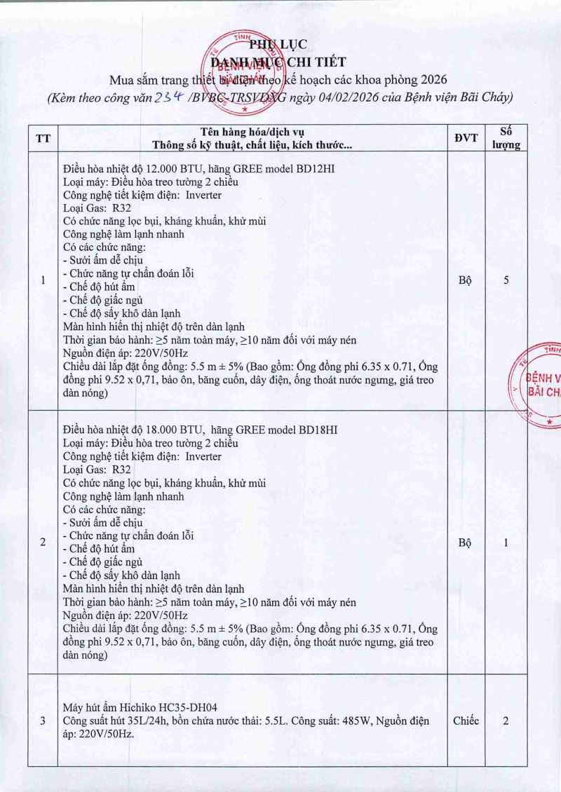 Thông báo số 234 về nhu cầu mua sắm trang thiết bị điện theo kế hoạch các khoa phòng 2026 2026/02/06 01:50
