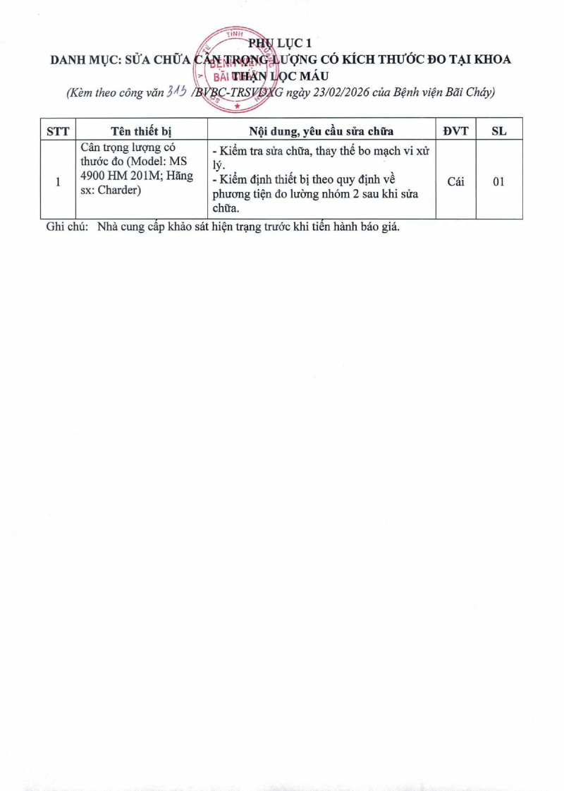 Thông báo số 313 về nhu cầu sửa chữa cân trọng lượng có thước đo tại khoa Thận lọc máu 2026/02/23 08:09