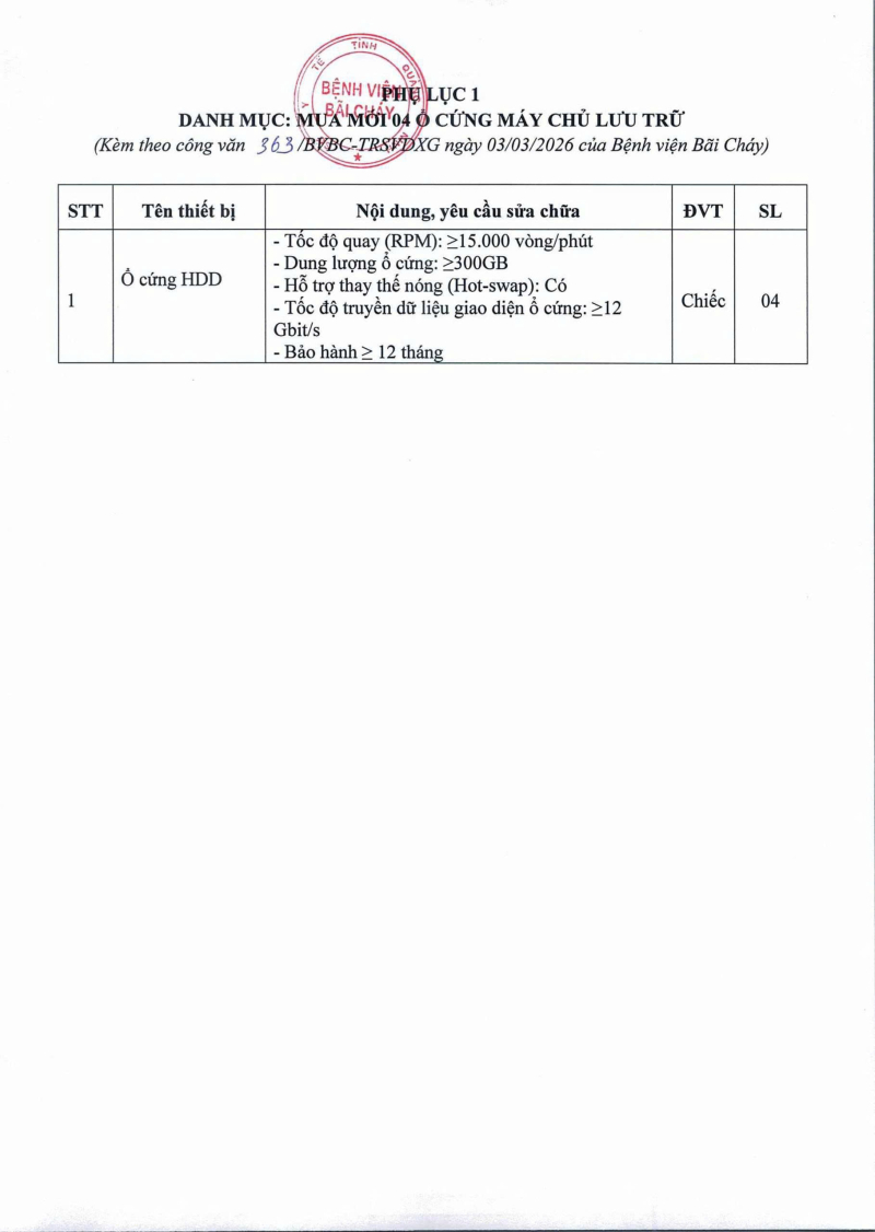 Thông báo số 363 về nhu cầu mua mới 04 ổ cứng máy chủ lưu trữ