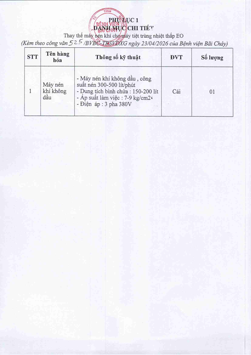 Thông báo số 525 về nhu cầu thay thế máy nén khí cho máy tiệt trùng nhiệt thấp EO