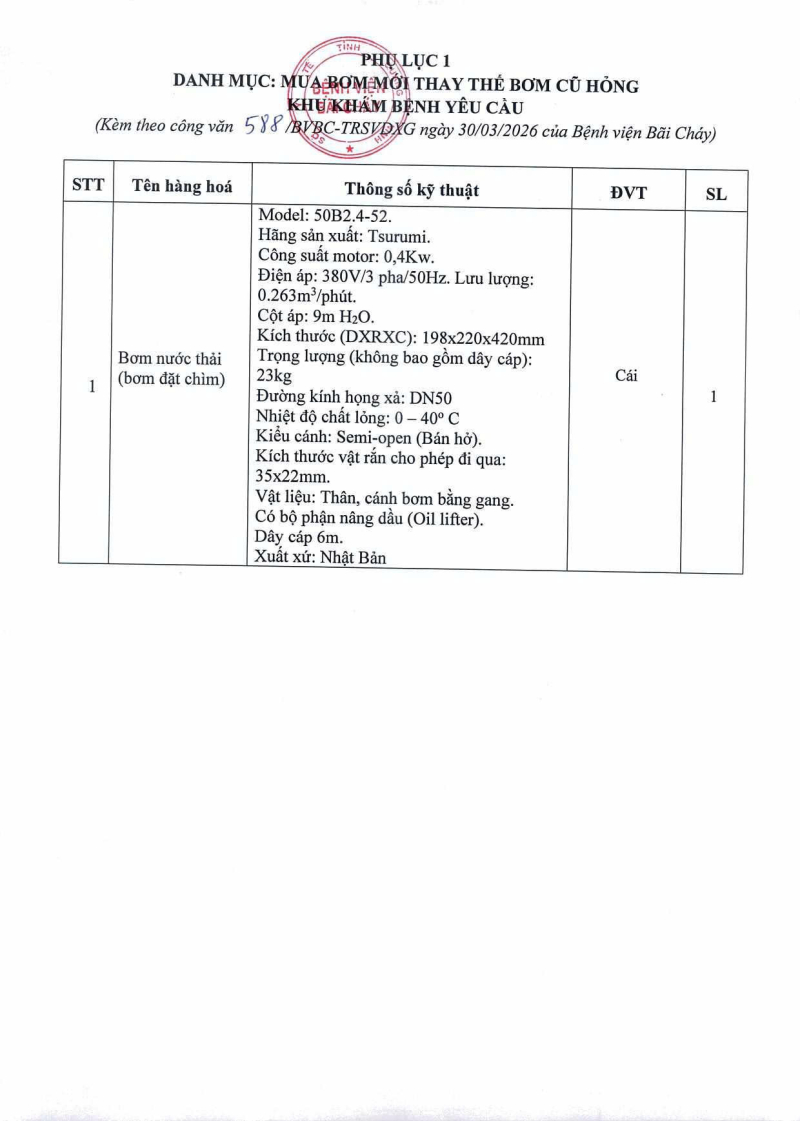 Thông báo số 588 về nhu cầu mua bơm mới thay thế bơm cũ hỏng khu khám bệnh yêu cầu