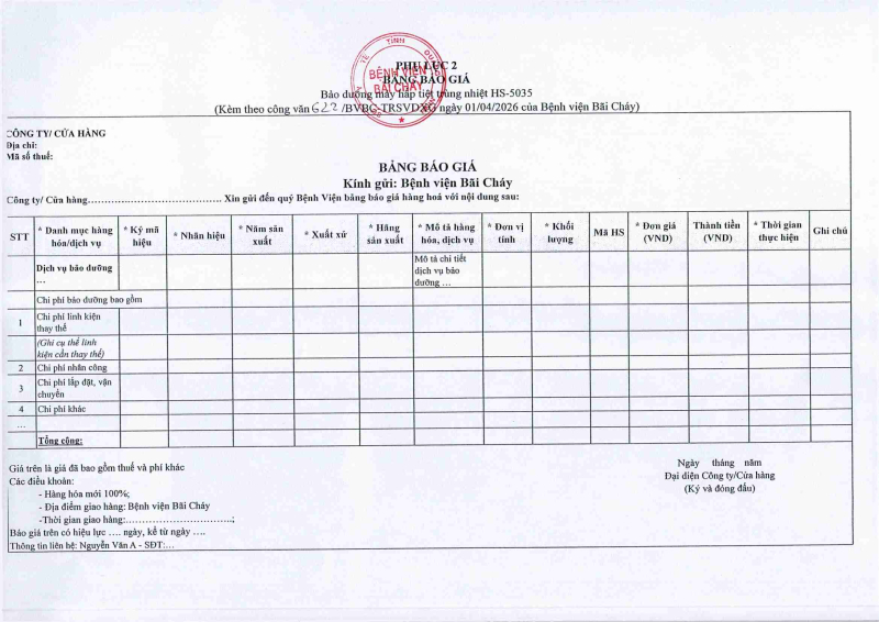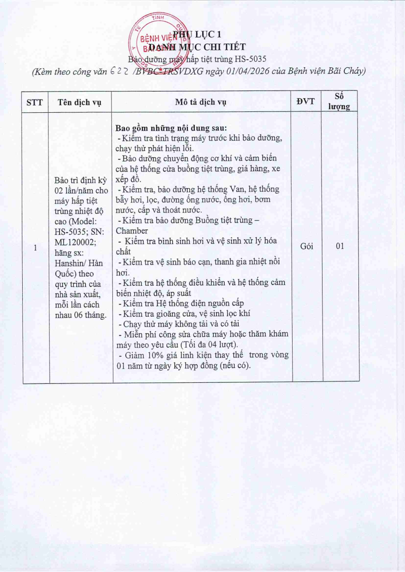 Thông báo số 622 về nhu cầu bảo dưỡng định kỳ máy hấp tiệt trùng HS–5035